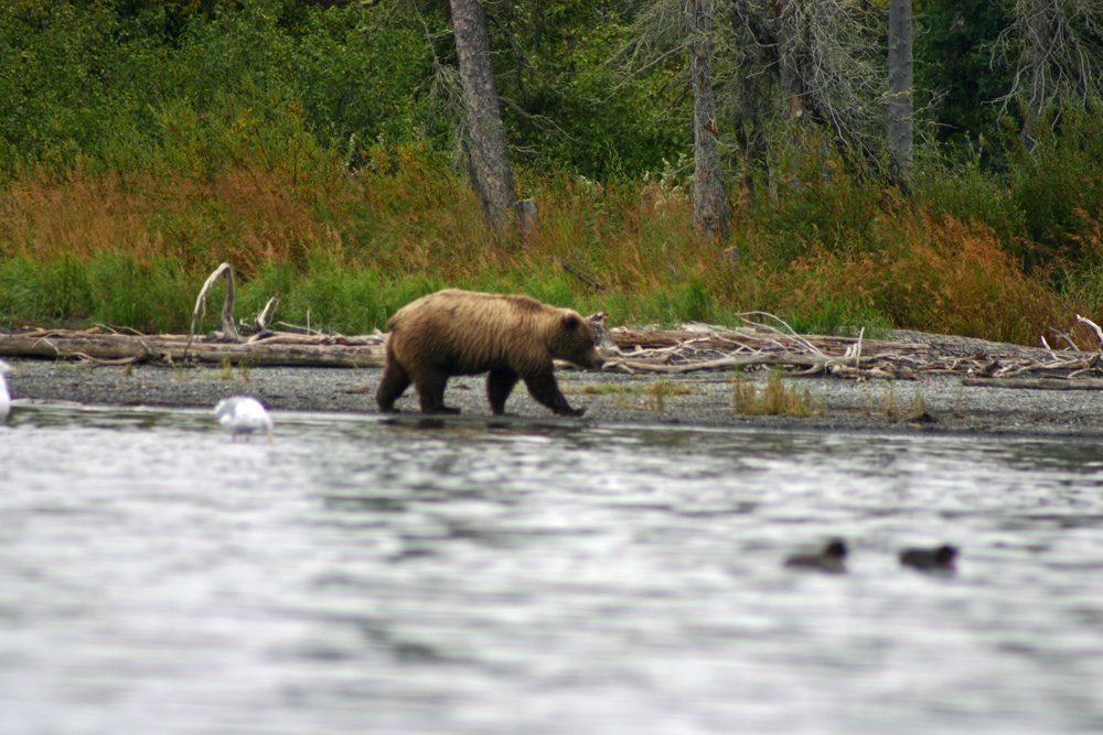 While on the boat ride across, the scenery along the coast is breathtaking. On most days you can see glaciers, volcanoes, whales, sea otters, puffins, sea birds, bald eagles, and of course, bears.